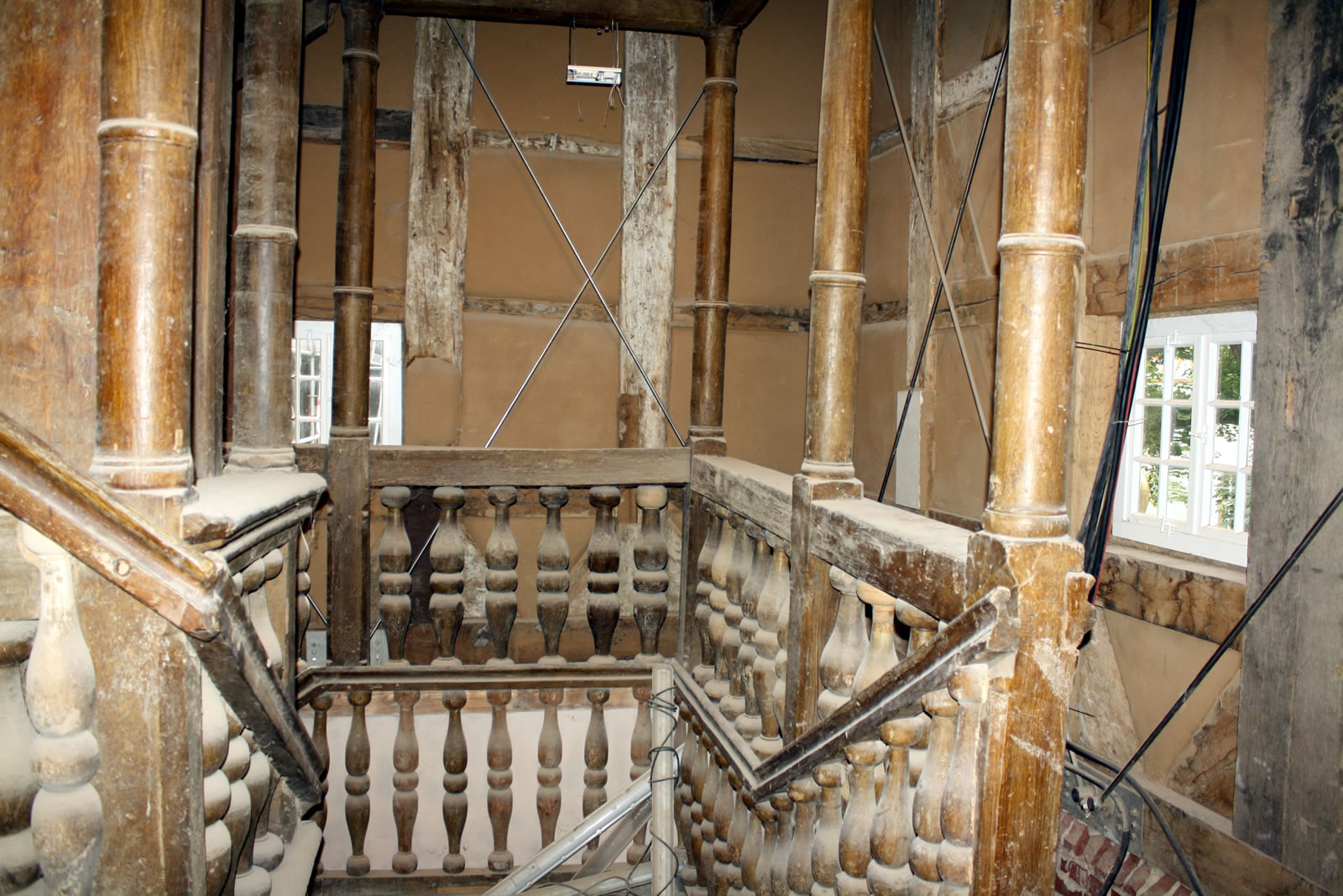 Im Rahmen der umfassenden Sanierung des größten Fachwerkschlosses Niedersachsens wurde auch der historisch bedeutende Uhrturm einer intensiven Restaurierung unterzogen. Errichtet zwischen 1648 und 1660 als Teil des Sieberflügels, besticht der 37 Meter hohe Turm durch üppige, figürlich gestaltete Fassadenelemente, die jedoch durch jahrhundertelange Witterungseinflüsse und strukturelle Belastungen stark beschädigt waren. Die Restaurierungsarbeiten umfassten unter anderem die statische Instandsetzung der gesamten Konstruktion, die Erneuerung verformter und gerissener Abdeckbleche an der Turmspitze sowie die fachgerechte Aufarbeitung des historischen Uhrwerks und der kunstvollen Schnitzereien. Mit einer mehr als dreijährigen Bauzeit und einem erheblichen finanziellen Aufwand wurde so der Fortbestand und die beeindruckende Ausstrahlung dieses Bauelements nachhaltig gesichert.
